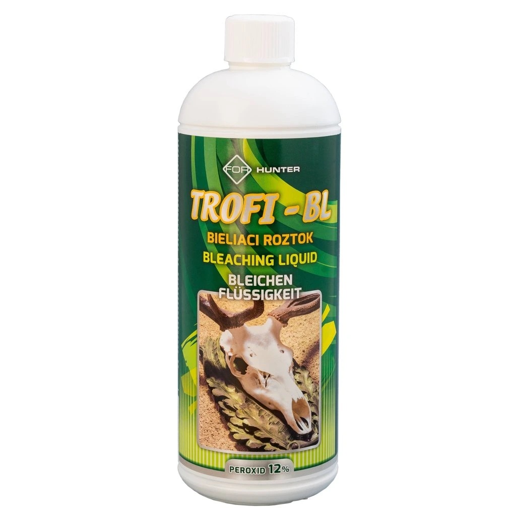 • bělící roztok na bázi peroxidu vodíku • pro účinné a rychlé bělení nových nebo i starších trofejí • produkt se používá v koncentrovaném nebo zředěném stavu (poměr ředění 1:2) • báze peroxidu vodíku (obsah 11,99%) • objem 1 L (1,05 kg)